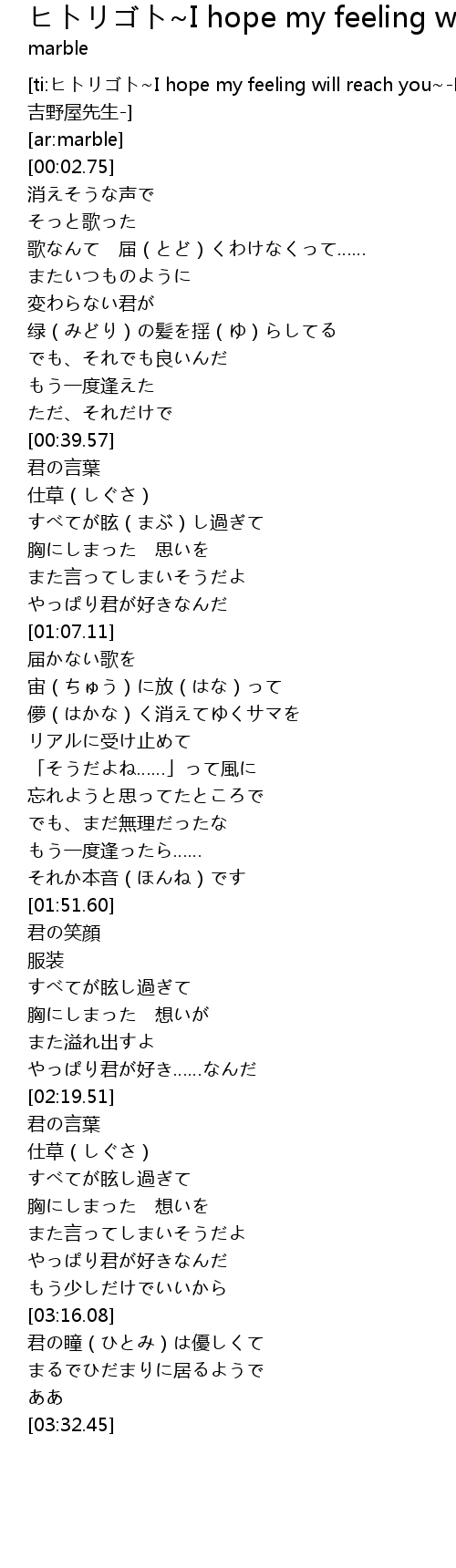 | [ti:ヒトリゴト~I hope my feeling will reach you~-LOVE SONG for 吉野屋先生-] | |