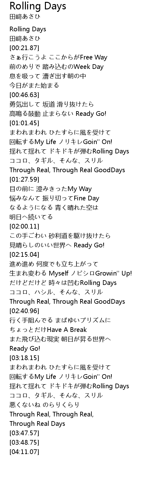 | [03:31.18] | 揺れて揺れて ドキドキが弾むRolling Days |