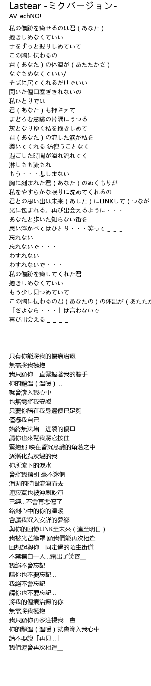 | [03:53.600] | この胸に伝わるの君(あなたの)の体温が(あたたかさ) |
