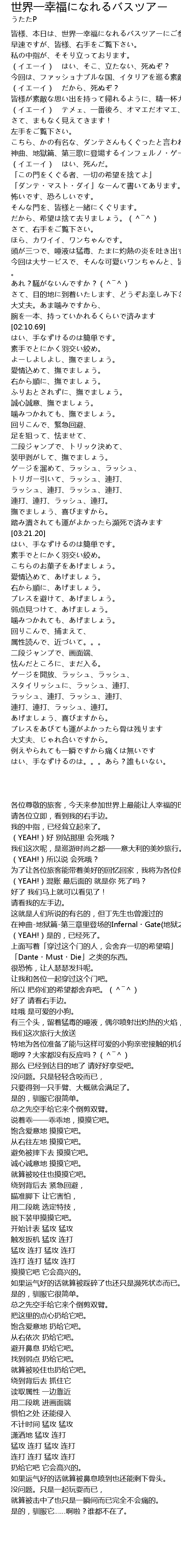 | [00:14.49] | 皆様、本日は、世界一幸福になれるバスツアーにご参加頂き、真にありがとうございます。 |