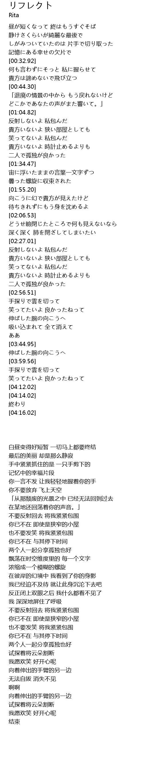 | [01:44.73] | 宙に浮いたままの言葉一文字ずつ |
