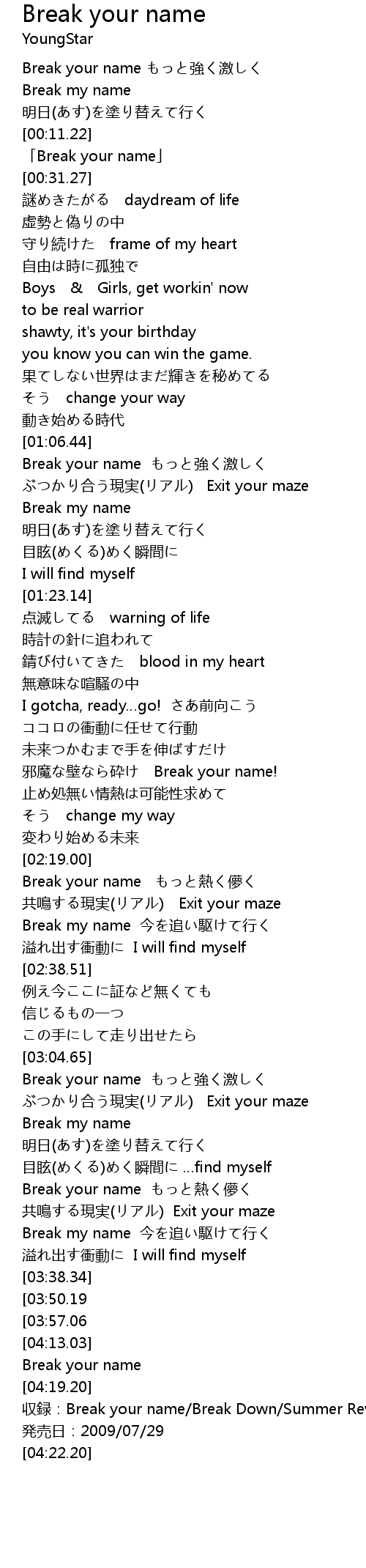 | [04:04.19][03:50.19] | Break your name Break your life |