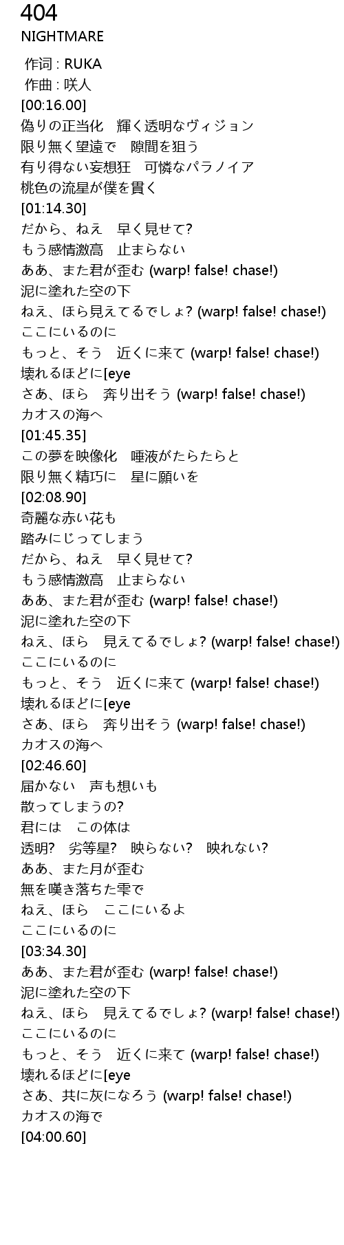 | [02:21.45] | ああ、また君が歪む (warp! false! chase!) |