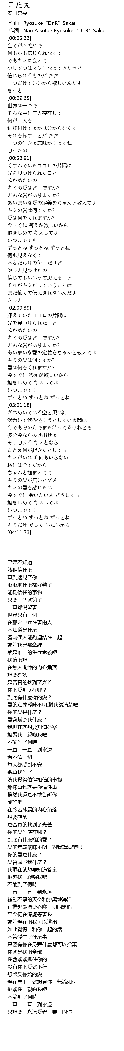 | [00:01.00] | 作词 : Nao Yasuta · Ryosuke“Dr.R”Sakai |