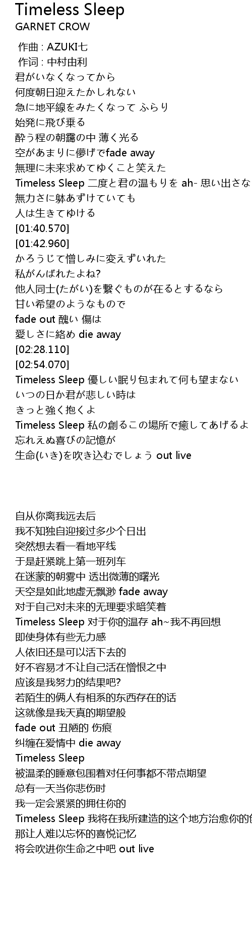 | [02:56.070] | Timeless Sleep 優しい眠り包まれて何も望まない |