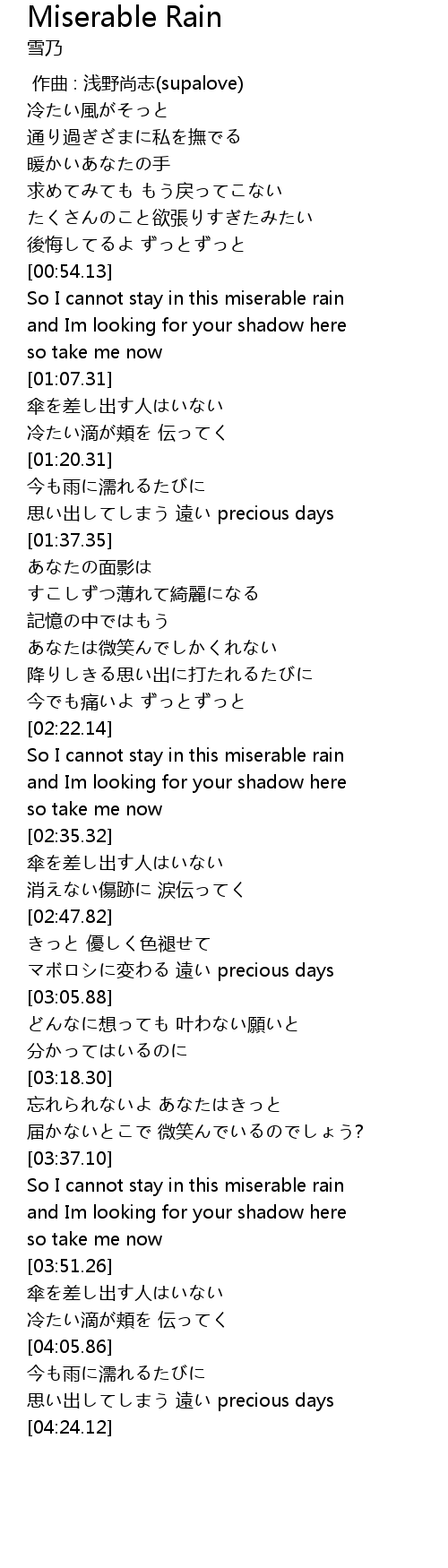 | [02:22.53] | So I cannot stay in this miserable rain |