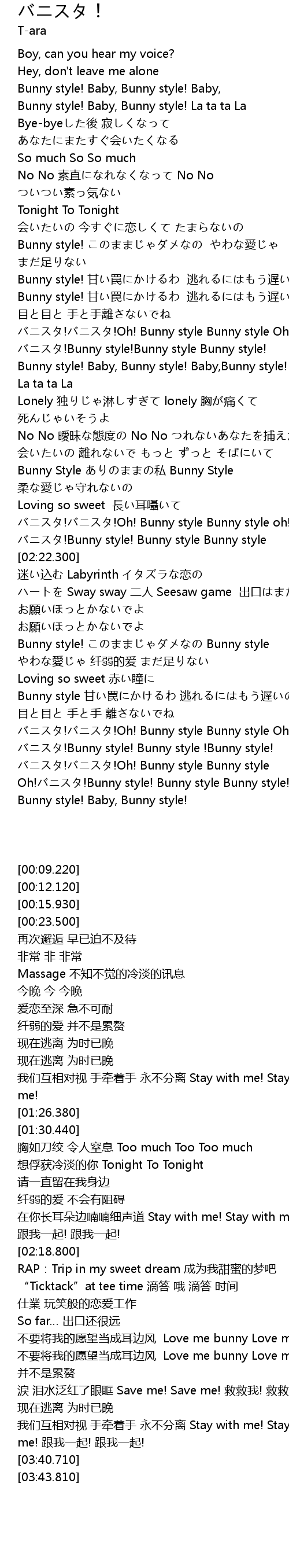 | [03:08.920] | Bunny style! このままじゃダメなの Bunny style やわな愛じゃ 纤弱的爱 まだ足りない |