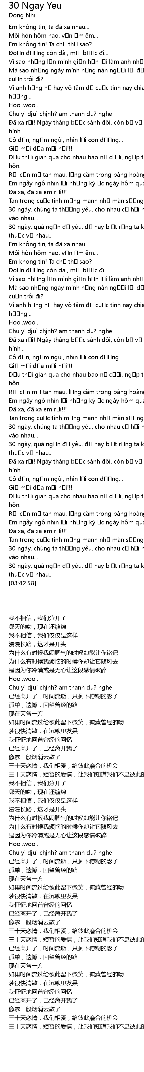 | [03:39.13] | 30 ngà y, quá ng n y u, nay bi t r ng ta kh ng thu c v nhau.. |