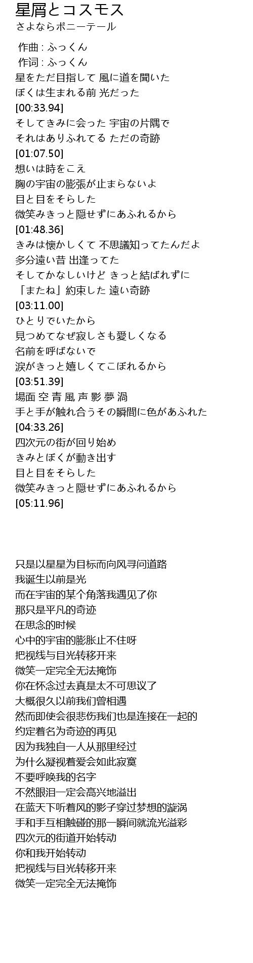 | [00:34.78] | そしてきみに会った 宇宙の片隅で |