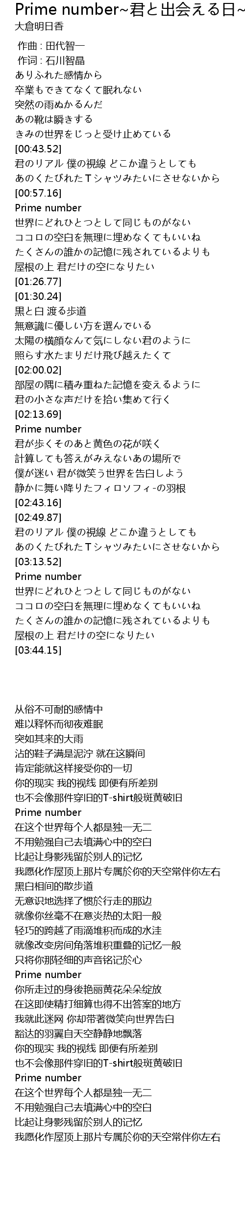 | [00:43.96] | 君のリアル 僕の視線 どこか違うとしても |