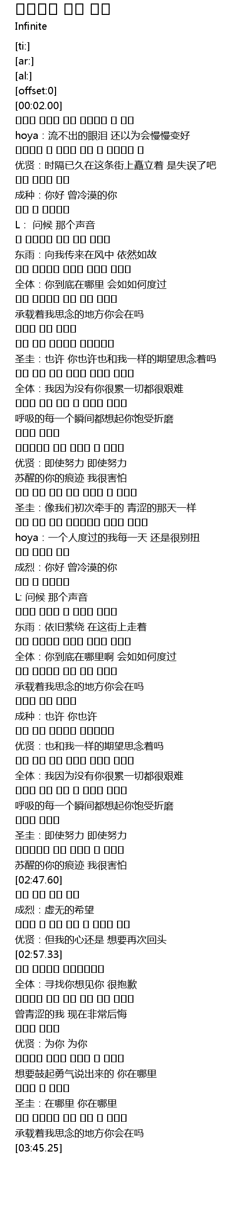 | [03:00.73] | 全体:寻找你想见你 很抱歉 |