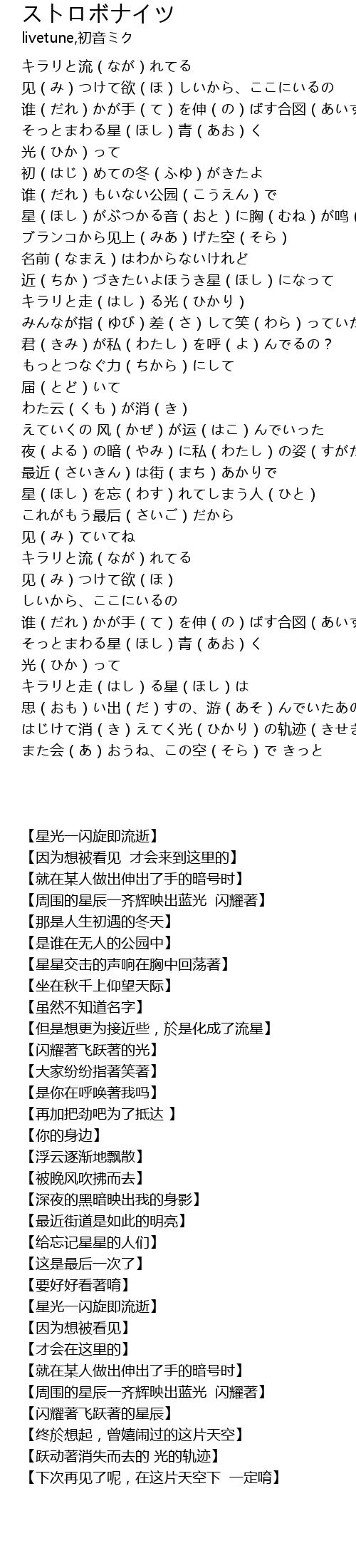| [01:39.41] | 星(ほし)がぶつかる音(おと)に胸(むね)が鸣(な)る |