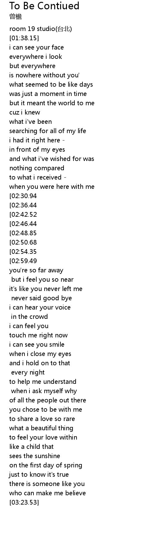 | [03:58.80][02:59.49][01:32.56] | to be loved |