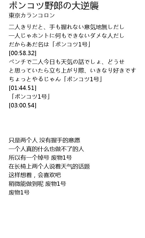 | [01:38.48] | ちょっとやるじゃん「ポンコツ1号」 |
