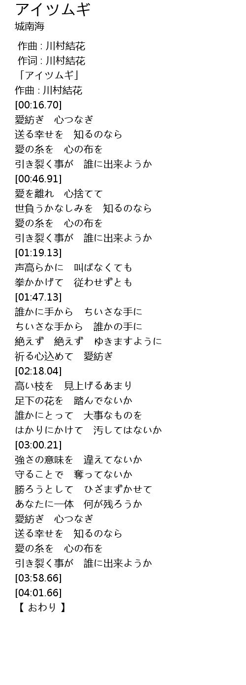 | [03:30.03] | 愛紡ぎ 心つなぎ |