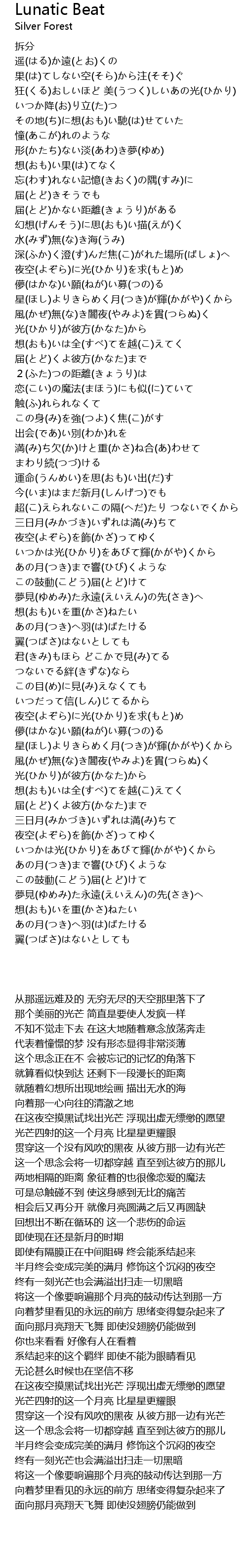 | [03:42.650] | 夜空(よぞら)に光(ひかり)を求(もと)め 儚(はかな)い願(ねが)い募(つの)る |