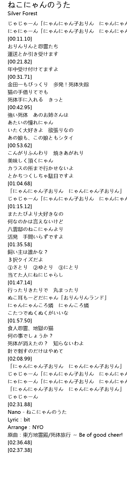 | [02:19.60] | にゃにゃーん「にゃんにゃん子おりん にゃんにゃん子おりん」 |
