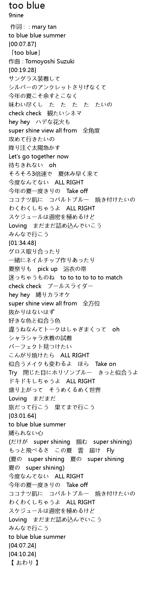 | [00:10.28] | 「too blue」 |