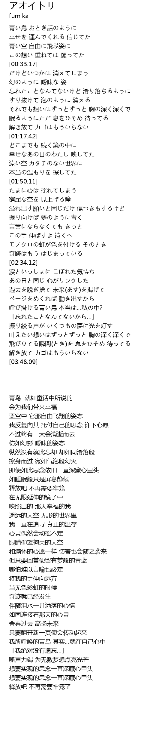 | [00:10.06] | 青い鳥 おとぎ話のように |