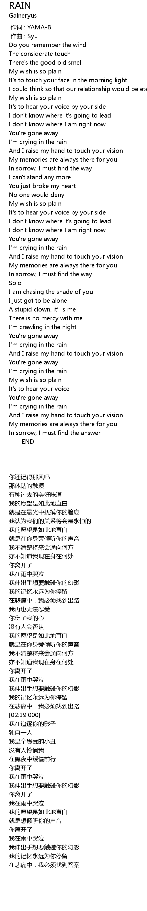 | [02:07.000] | I'm crying in the rain |