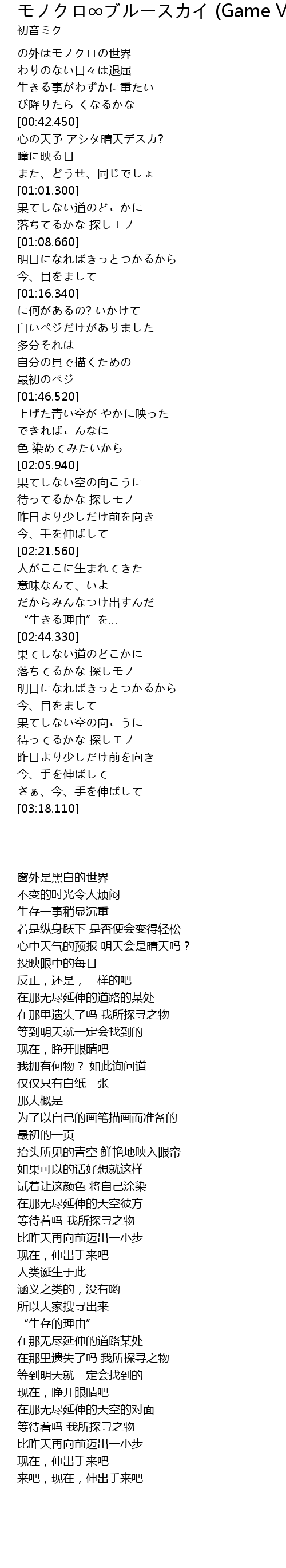 | [00:13.350] | の外はモノクロの世界 |