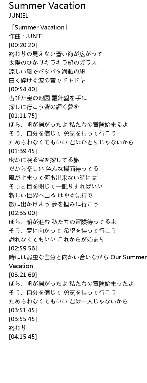 | [03:00.31] | 時には弱虫な自分と向かい合いながら Our Summer Vacation |