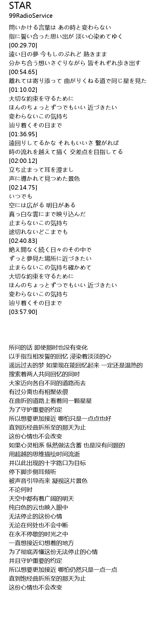 | [00:57.42] | 離れては寄り添って 曲がりくねる道で同じ星を見た |