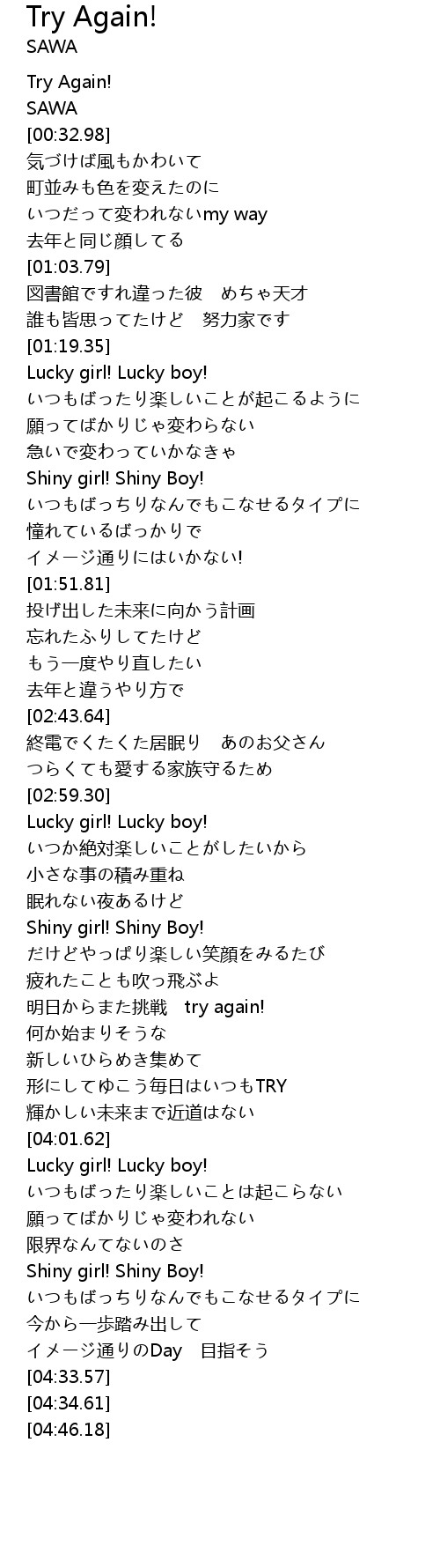 | [04:17.08] | Shiny girl! Shiny Boy! |