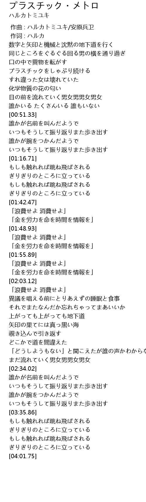 | [00:00.00] | 作曲 : ハルカトミユキ/安原兵卫 |