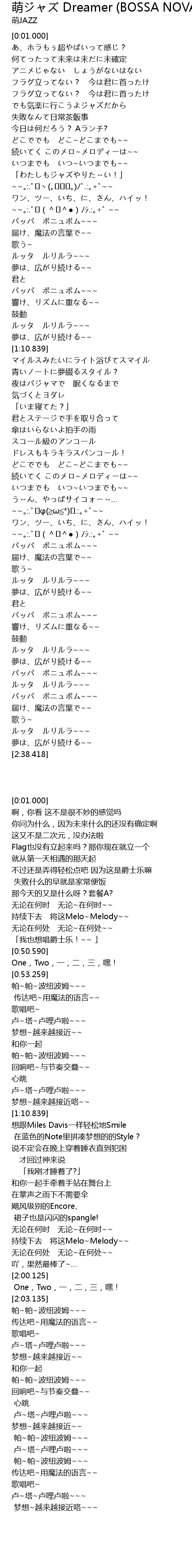 | [2:00.125] | ~~。:.゚♪φ(≧ω≦*)♪.:。+゚~~ |