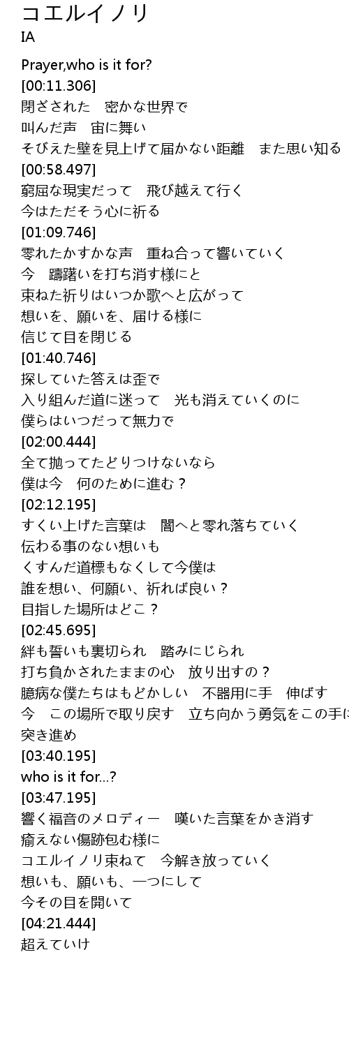 | [04:00.444] | コエルイノリ束ねて 今解き放っていく |