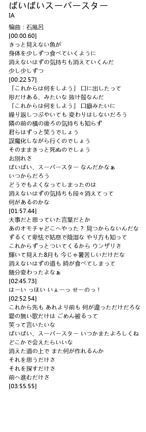 | [03:24.90] | ばいばい、スーパースター いつかまたよろしくね |