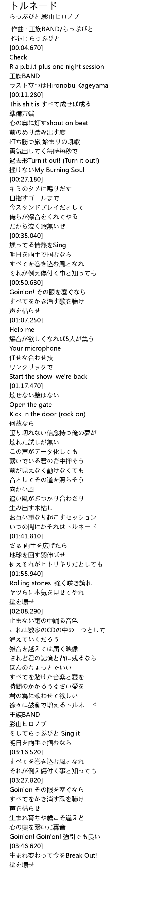 | [00:00.00] | 作曲 : 王族BAND/らっぷびと |