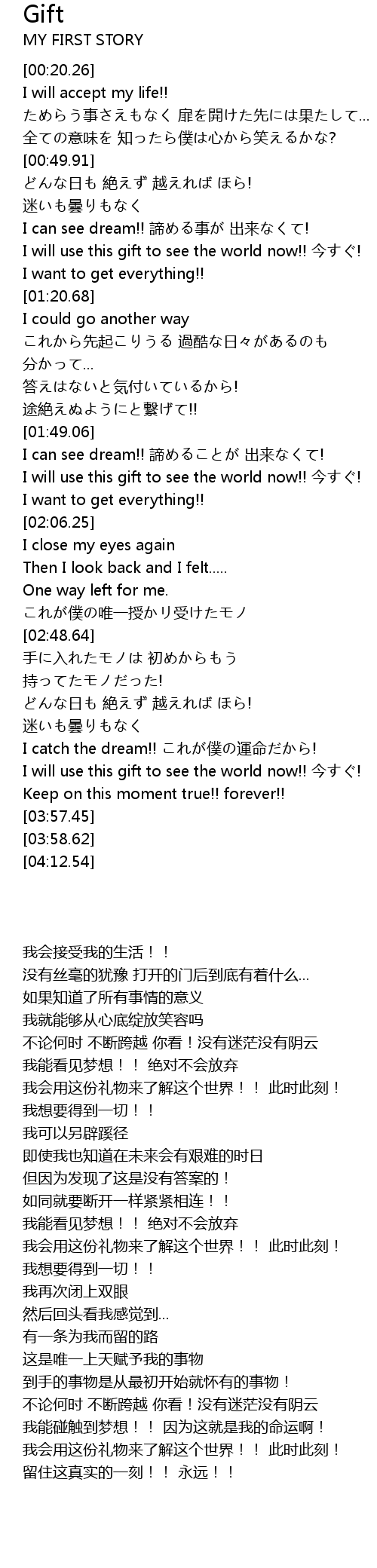 | [03:43.24] | I will use this gift to see the world now!! 今すぐ! |