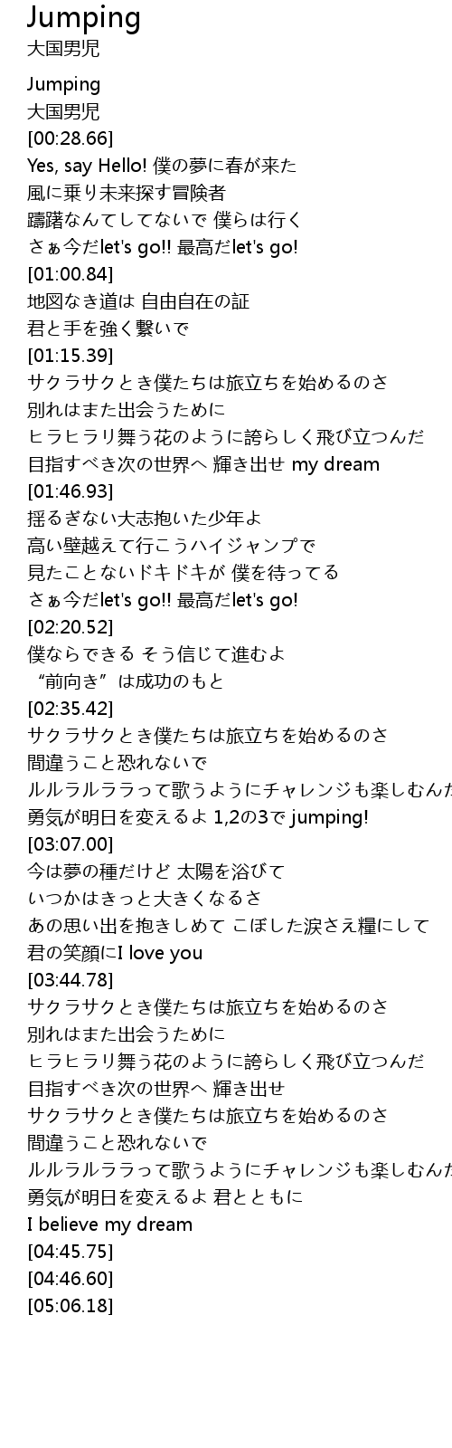 | [02:56.18] | 勇気が明日を変えるよ 1,2の3で jumping! |