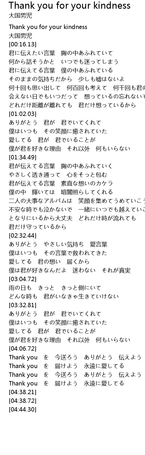| [04:08.55] | Thank you を 今送ろう ありがとう 伝えよう |