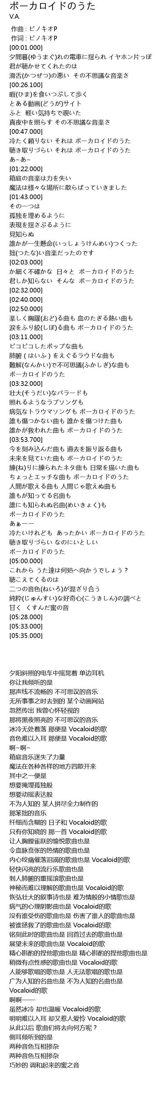 | [03:21.000] | 難解(なんかい)で不可思議(ふかしぎ)な曲も ボーカロイドのうた |