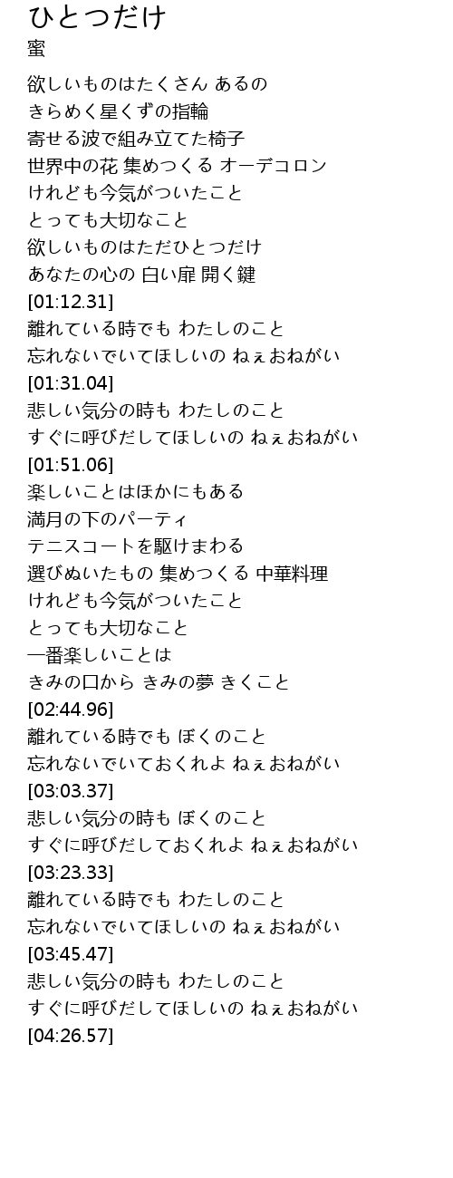 | [01:39.75] | すぐに呼びだしてほしいの ねぇおねがい |