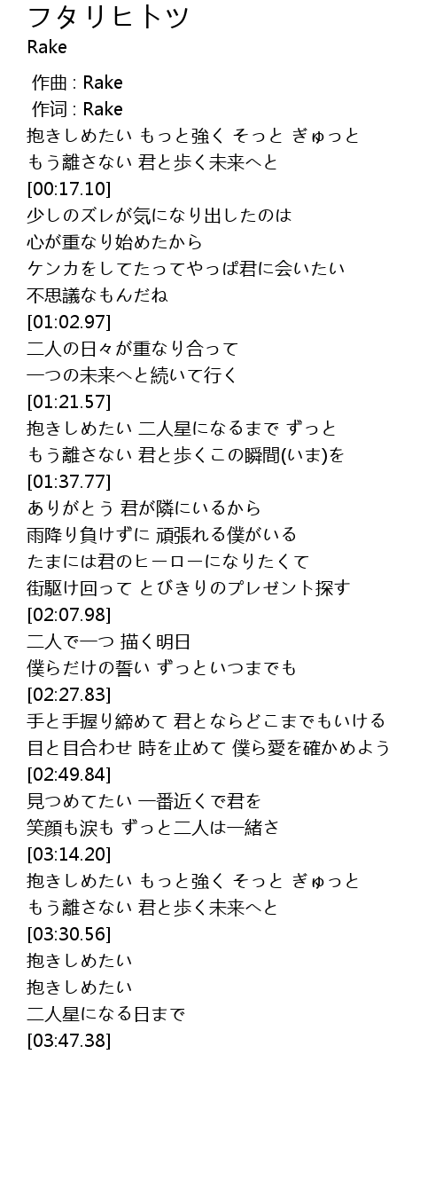 | [01:39.14] | ありがとう 君が隣にいるから |
