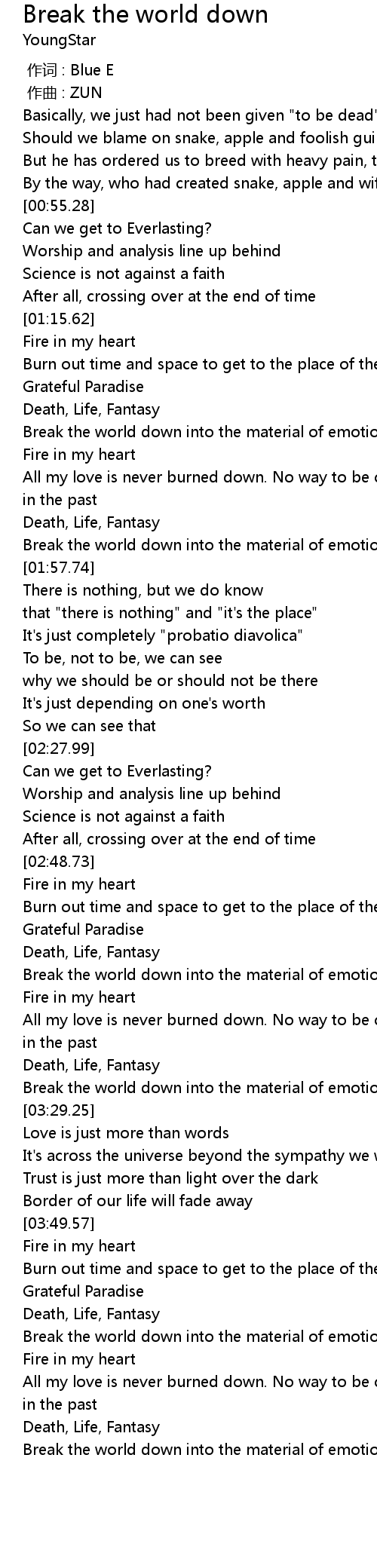| [04:03.86] | Break the world down into the material of emotions in my mind |