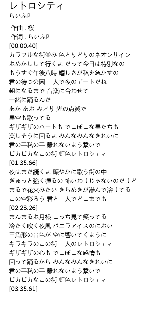 | [01:29.71] | ピカピカなこの街 虹色レトロシティ |
