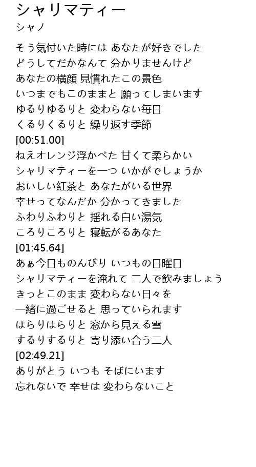 | [02:08.66] | シャリマティーを淹れて 二人で飲みましょう |