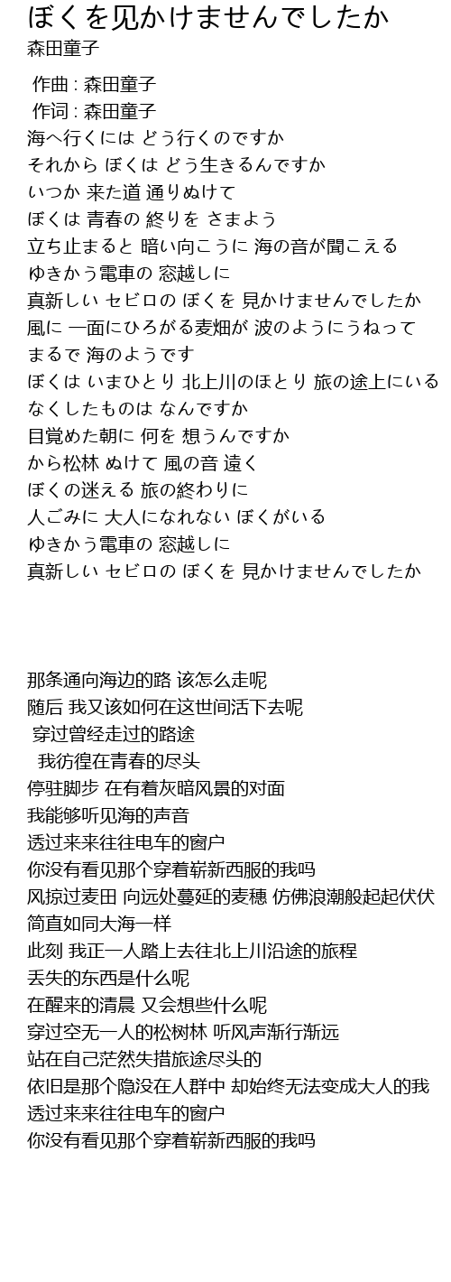 | [03:34.86] | 真新しい セビロの ぼくを 見かけませんでしたか |