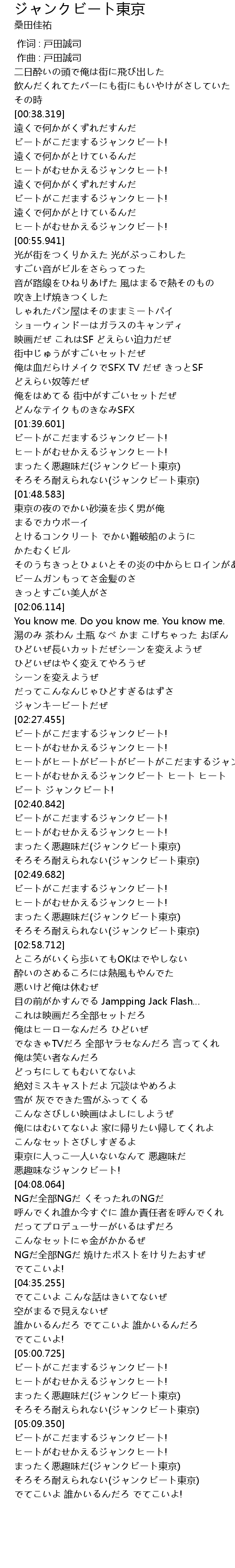 | [00:38.496] | 遠くで何かがくずれだすんだ ビートがこだまするジャンクビート! |