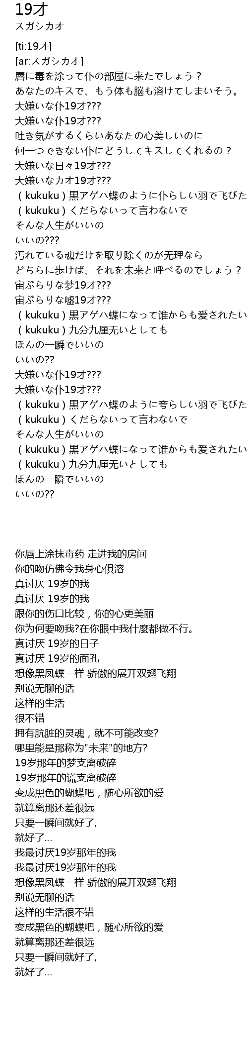 | [02:52.333] | (kukuku)黒アゲハ蝶のように夸らしい羽で飞びたい |