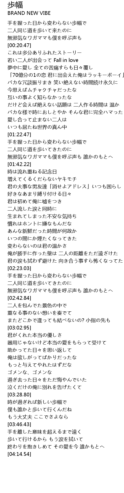 | [01:22.68] | 手を握った日から変わらない歩幅で |