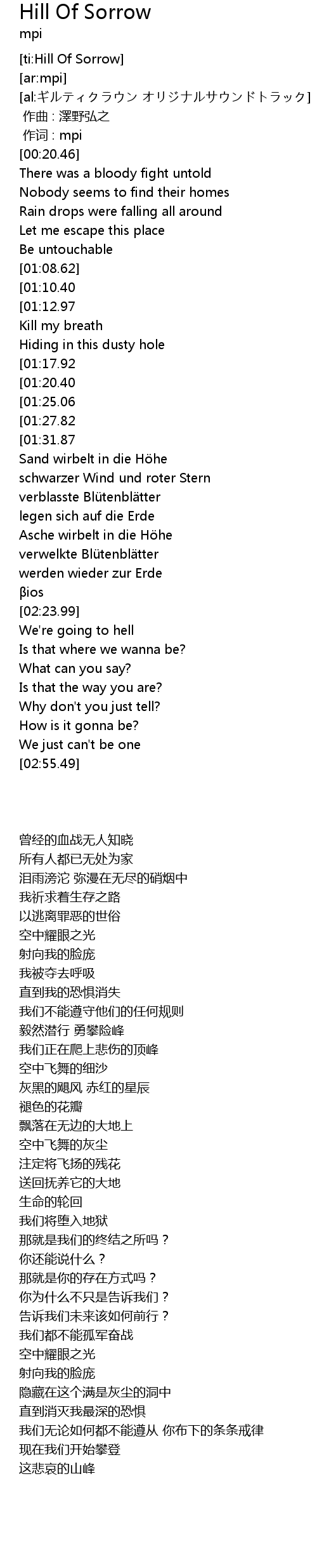| [03:20.41][01:27.82] | Oh! The hill of sorrow |