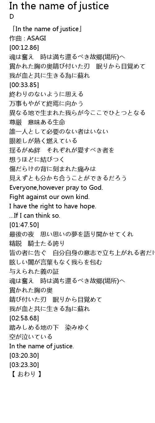 | [00:14.86] | 魂は奮え 時は満ち還るべき故郷(場所)へ |