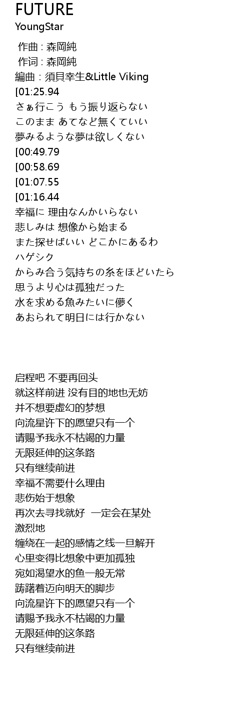 | [02:49.71][00:49.79] | 流れ行く星にかけた願いはひとつ |