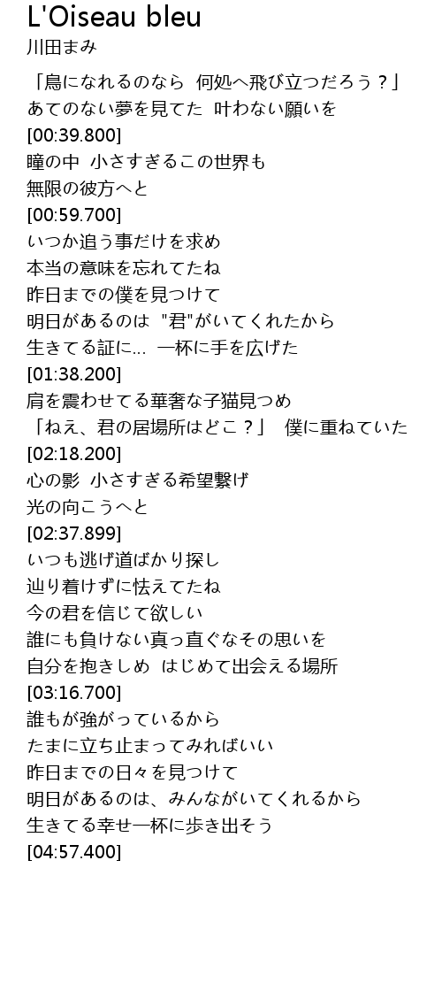 | [00:21.619] | 「鳥になれるのなら 何処へ飛び立つだろう?」 |